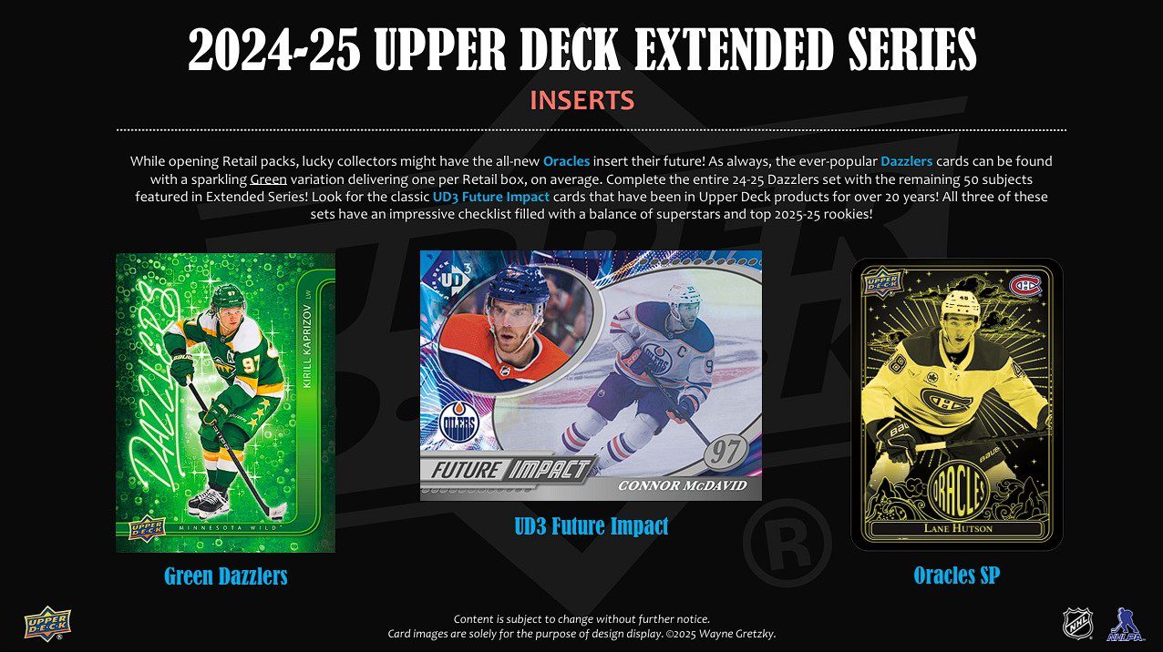 Extended Series přidává závěrečných 250 karet: 200 karet veteránů a 50 ks Young Guns nebo 1st Round Rookies – nováčků ze sezóny 2024-25, kteří byli vybráni v prvním kole draftu (1st Round). Be on the lookout for the elusive Outburst Parallels of these exciting cards: