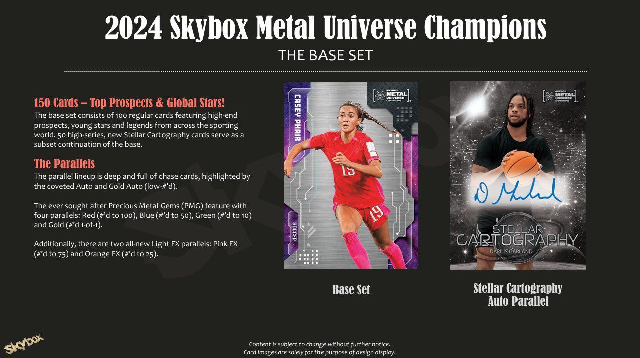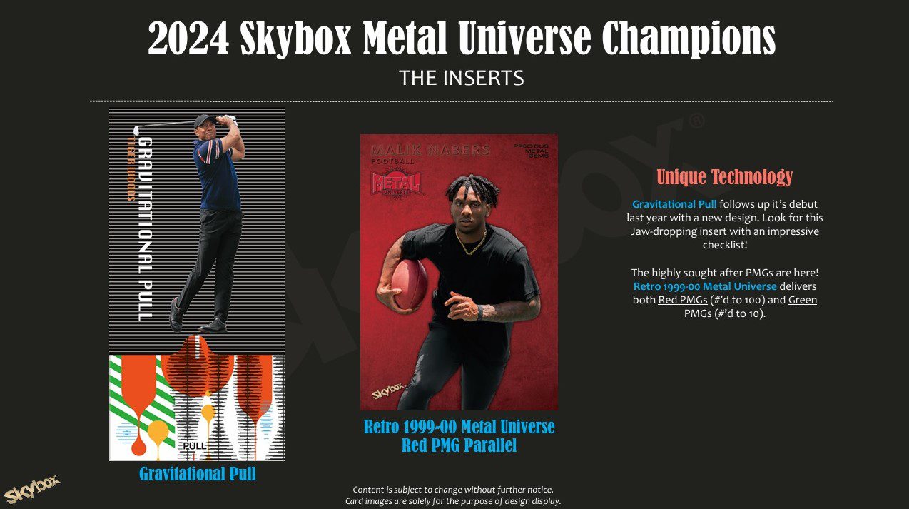 – 3x Scoring Magnets a New Discoveries kartySkybox Metal Universe Champions obsahuje velké množství severoamerických i mezinárodních talentovaných sportovců a mladých hvězd z různých sportů. Nechybějí ani legendy sportu, mediální osobnosti a hudebníci. S rozmanitými checklisty, krásným designem a lákavými case hity patří Skybox Metal Universe Champions mezi nejzajímavější produkty.