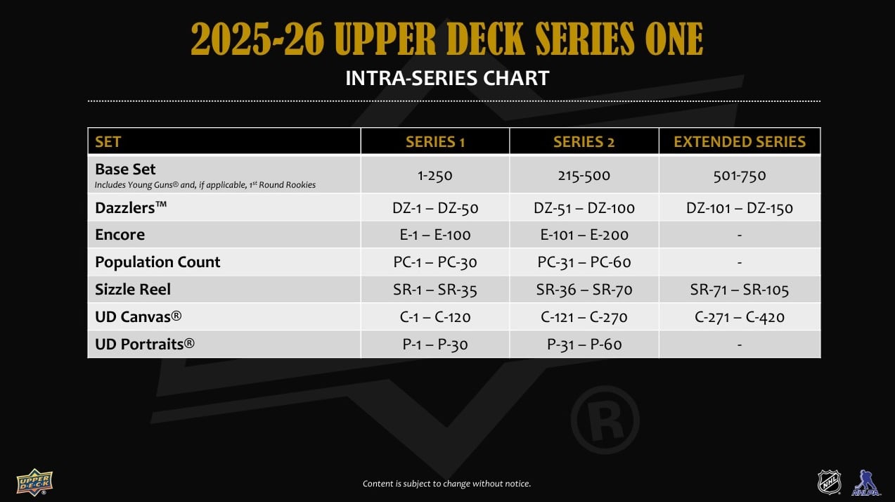 I v Retail verzích jsou také rookie karty rozděleny dle divizí NHL – Rookie Redemption 2025-26 rookies a velmi vzácné 2025 NHL® #1 Draft Pick SP Redemption karty.