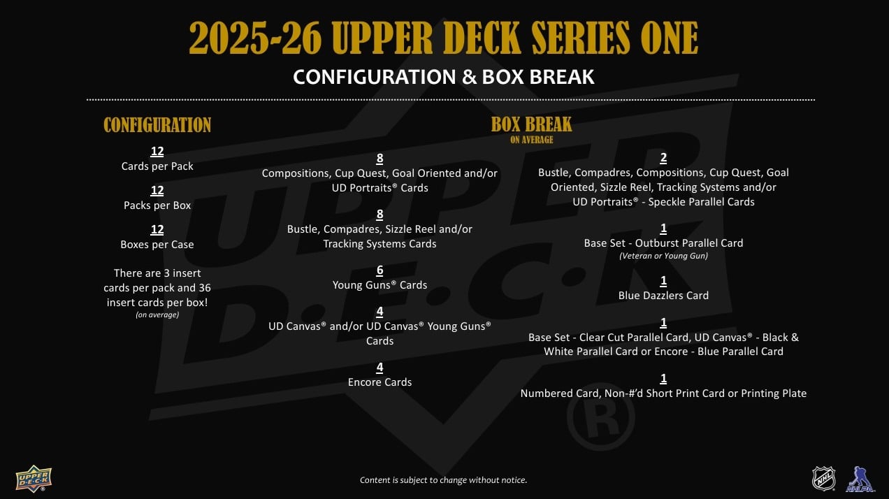 – 1x limitovaná kartu/Short Print kartu a/nebo Printing PlateSeries 1 je každoročně nejsbíranější hokejový set. Obsahuje celkem 250 karet: