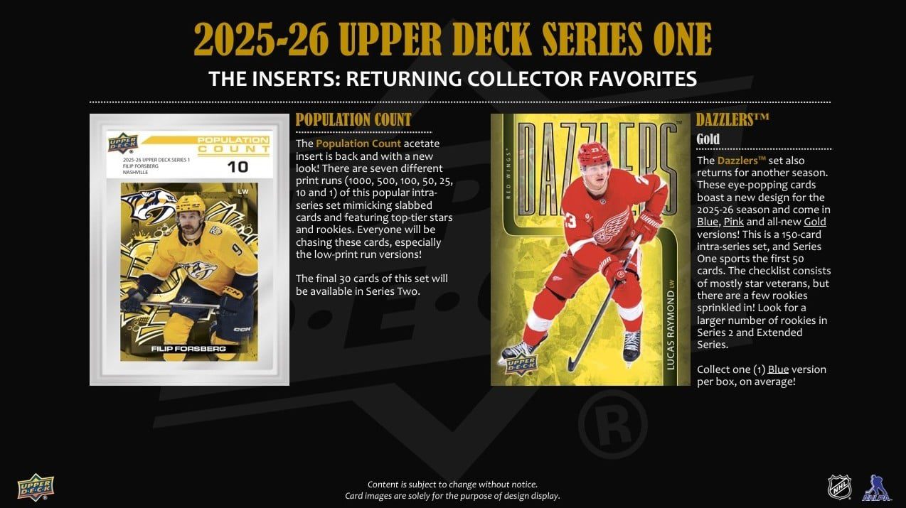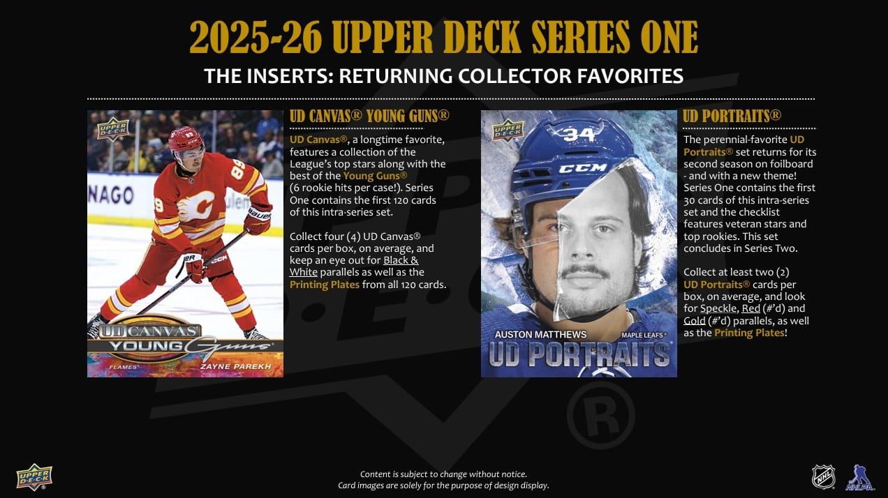 Oblíbené UD Portraits® se vrací podruhé na fólii – a s novými motivy! Series 1 obsahuje prvních 30 karet a checklist zahrnuje hvězdy i top nováčky (Matthews, Ostlund, Makar, Dvorský…). Sběratelé si mohou zkompletovat celý set 2025–26 UD Portraits® v Series 2.